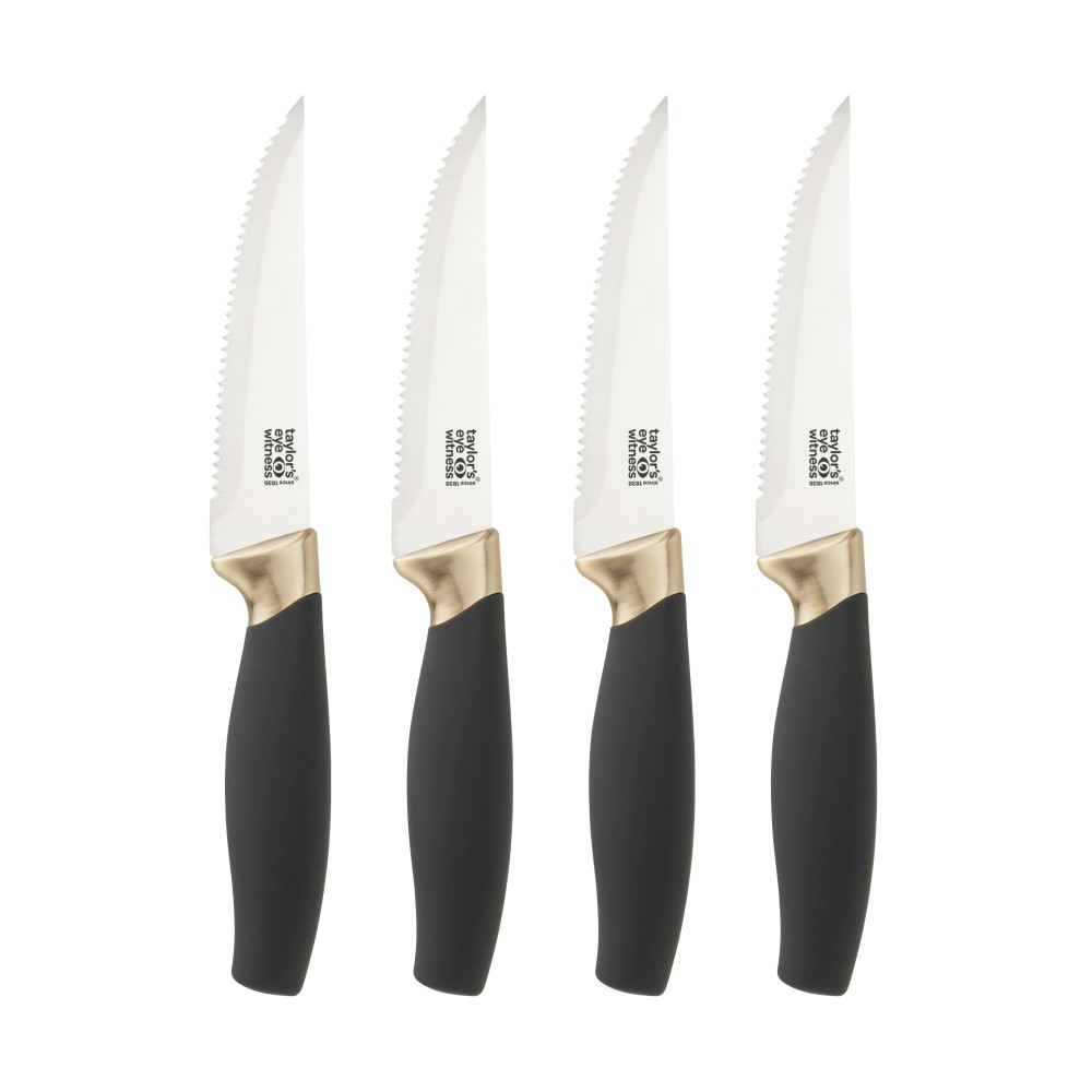 4er Set Steakmesser mit angenehmem Soft-Grip Griff für einen sicheren und bequemen Halt. Mit sehr scharfer Edelstahlklinge und messingfarbenem Kropf.