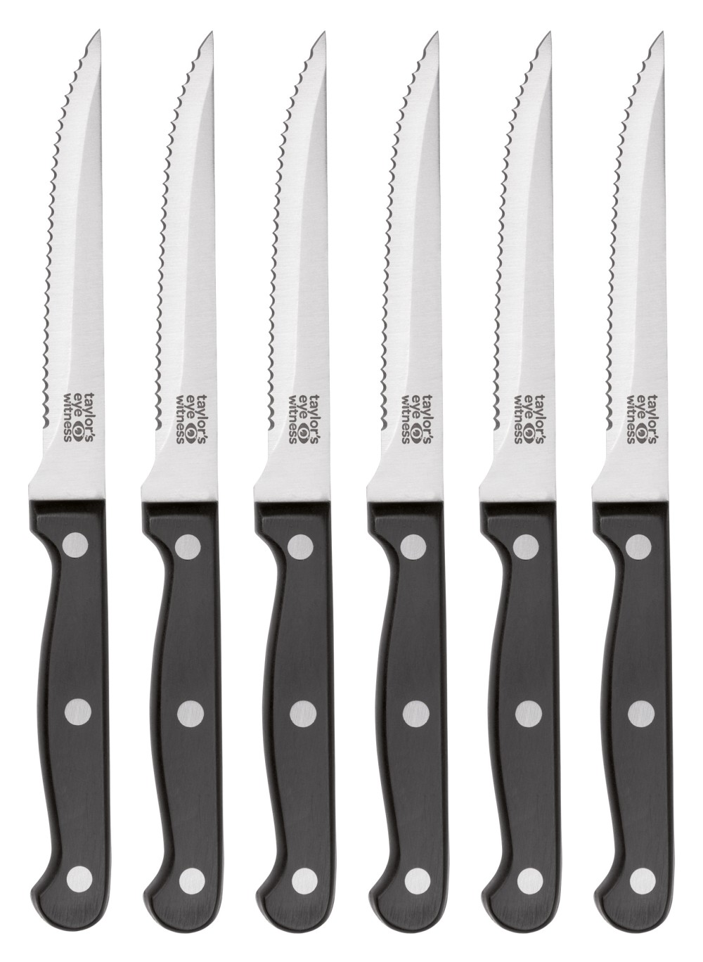 6er Set Steakmesser mit traditionellem dreifach vernietetem Vollerl-Griff. Mit sehr scharfer Edelstahlklinge und Wellenschliff.